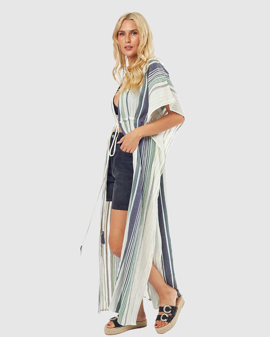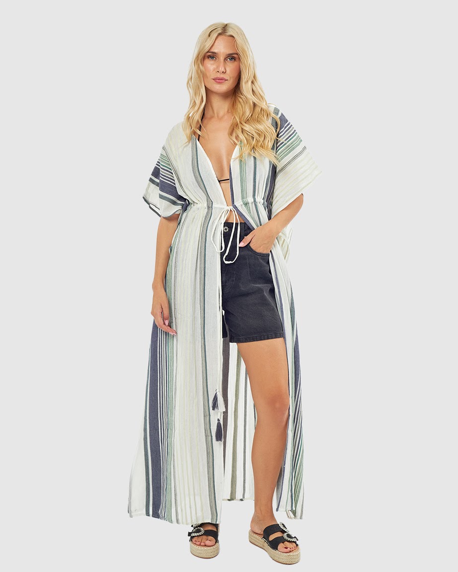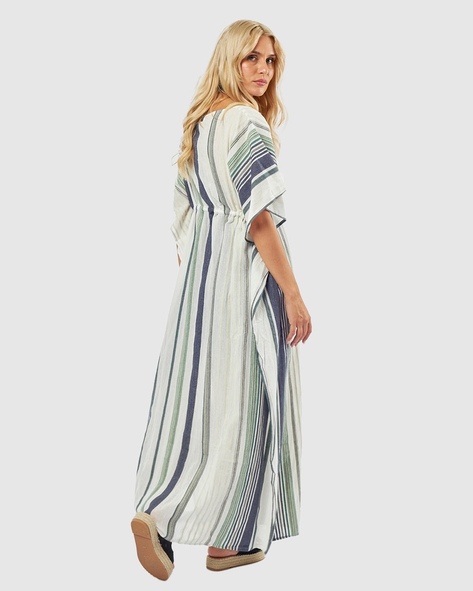 καφτάνι Verde από 100% βαμβάκι Ινδίας. Το μακρύ του μήκος, οι κάθετες ρίγες σε